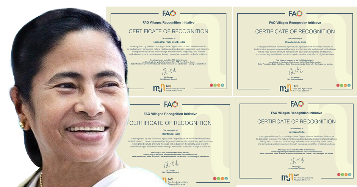 রাজ্যের জন্য বড় সুখবর। সামাজিক মাধ্যমে টুইট করে আন্তর্জাতিক স্বীকৃতির কথা জানালেন মুখ্যমন্ত্রী মমতা বন্দ্যোপাধ্যায়। তাঁর পোস্ট অনুযায়ী, রাষ্ট্রসংঘের খাদ্য ও কৃষি সংস্থা (Food and Agriculture Organization – FAO) বাংলার চারটি গ্রামকে ‘Globally Important Agricultural Heritage Systems’ (GIAHS) স্বীকৃতি প্রদান করেছে।